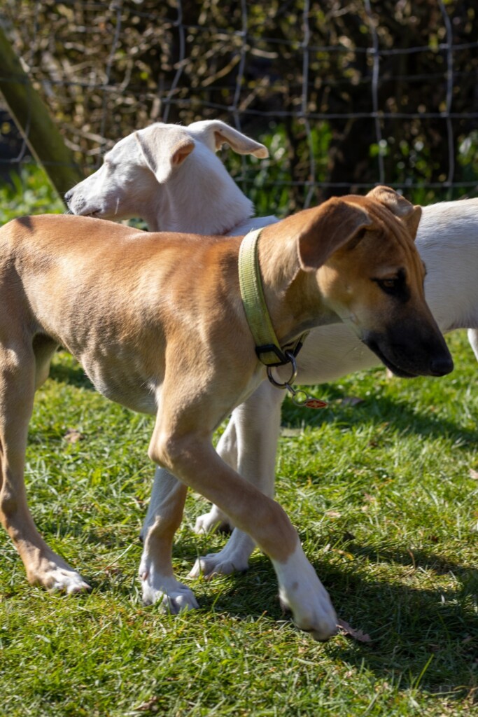 Joki is heel lief in het begin een beetje verlegen, ze moet echt even wennen aan nieuwe mensen en situaties, maar als ze eenmaal gewend is, is ze heel aanhankelijk. Ze is speels, sterk, nieuwsgierig en zachtaardig. Ze kan enorm hard rennen, waarschijnlijk zit er een scheutje windhondenbloed in haar. Ze kan heel goed met kinderen overweg en zou het beste passen bij een gezin dat haar even de tijd geeft om te wennen. Omdat ze wat onzeker is, is het fijn als ze een wat meer ervaren baasje krijgt. Ze is niet happerig en dat is erg fijn voor kleine kinderen. ’s Nachts blijft de bench meestal droog en schoon, en als je er op tijd bij bent, doet ze al veel van haar behoeften buiten. Ze kan al aan de lijn lopen, maar trekt nog wel wat, zeker als haar zusjes voorop lopen. Op de foto’s is ze de “egaal’ bruine hond